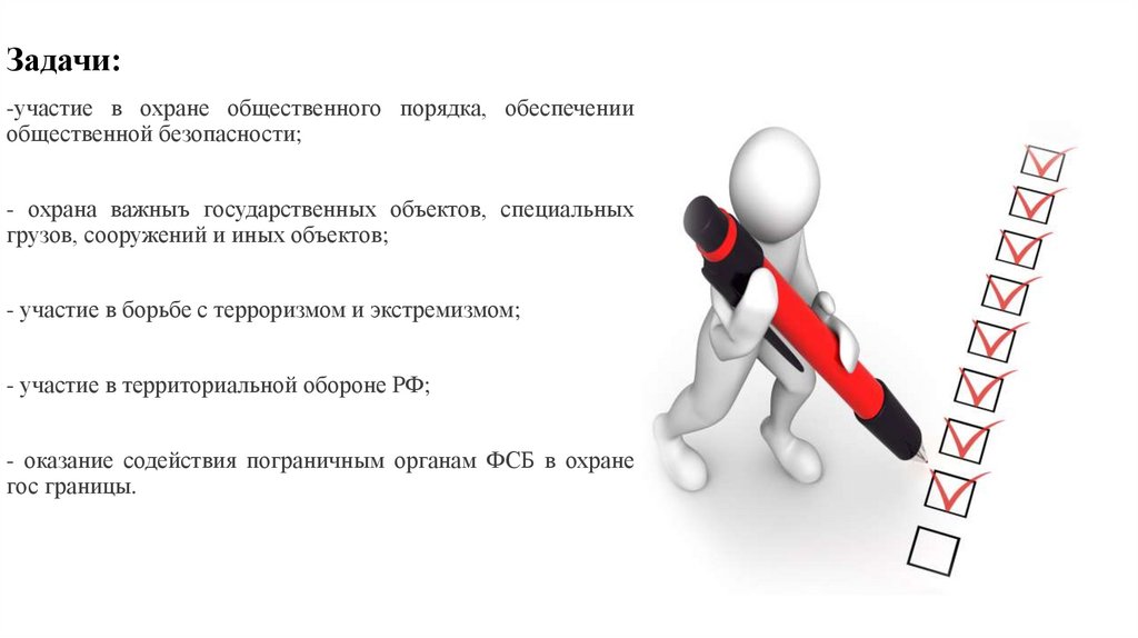 Задачи:-участие в охране общественного порядка, обеспечении