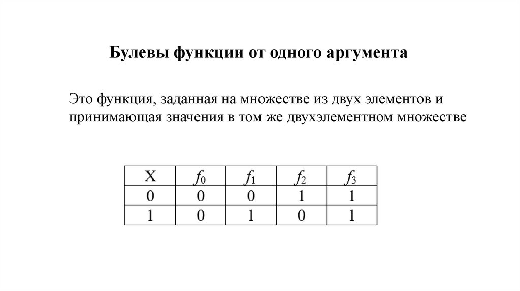 Булевы функции от одного аргументаЭто функция, заданная на множестве из двух элементов и