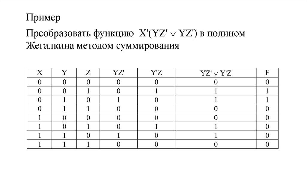 ПримерПреобразовать функцию Х'(YZ' YZ') в полином