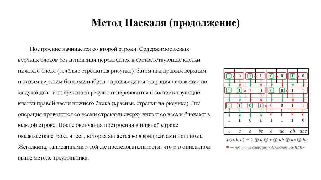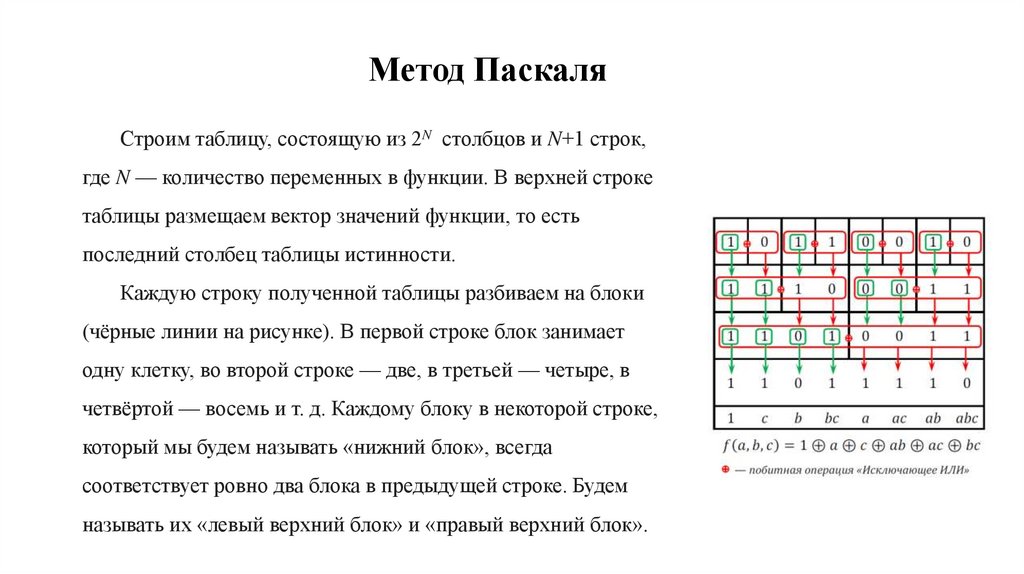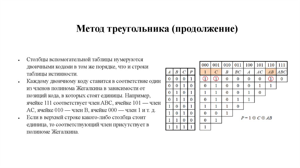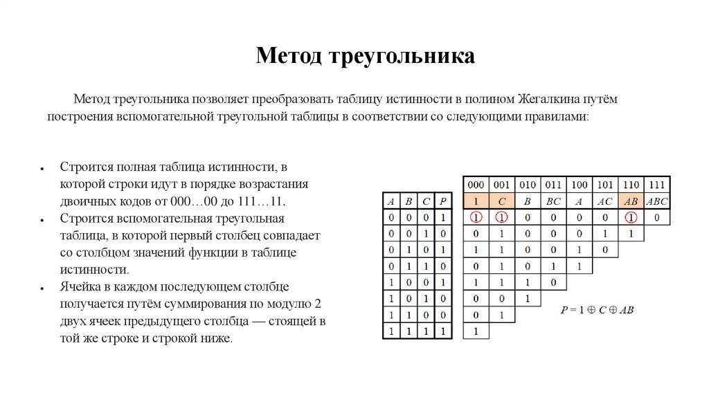 Метод треугольникаМетод треугольника позволяет преобразовать таблицу истинности в полином Жегалкина путём