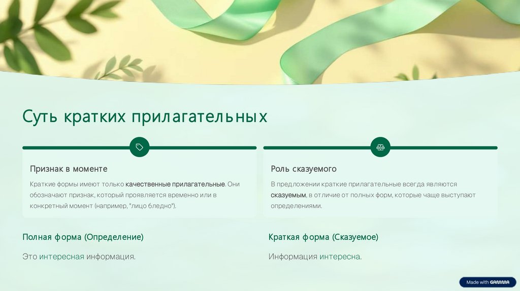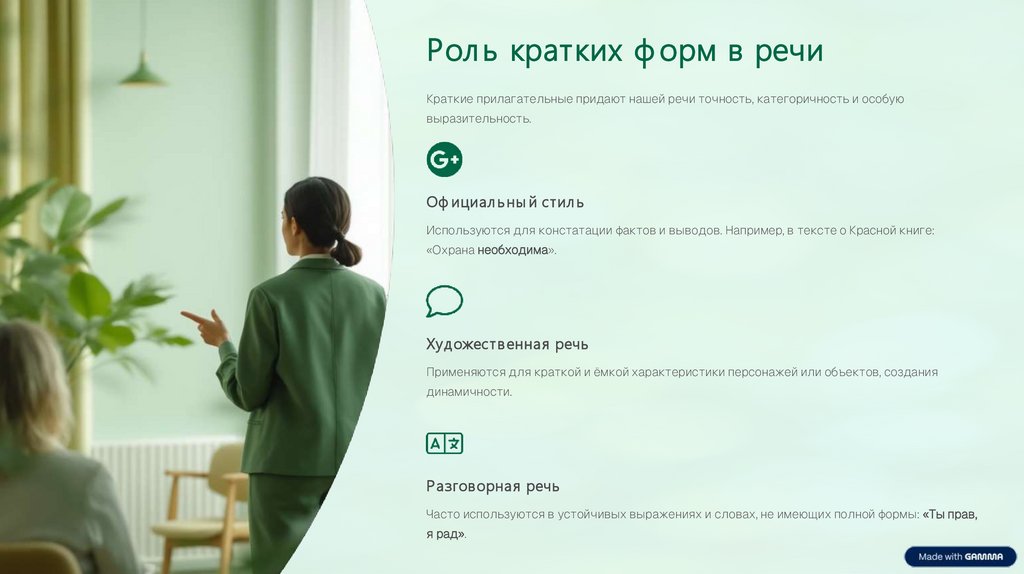 Рол ь кратких ф орм в речиКраткие прилагательные придают нашей речи точность, категоричность и особую