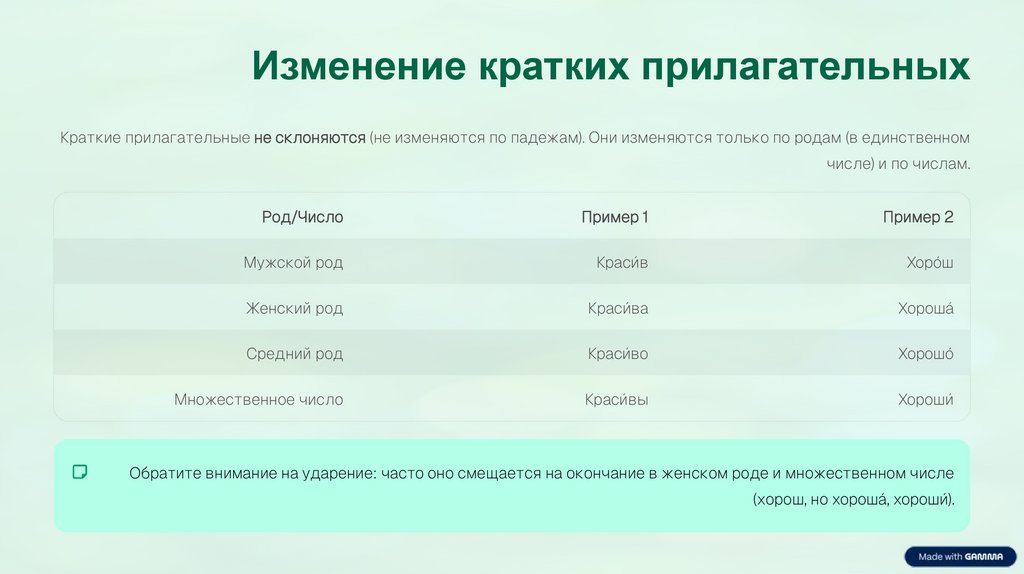 Изменение кратких прилагательныхКраткие прилагательные не склоняются (не изменяются по падежам). Они изменяются только по родам (в единственном