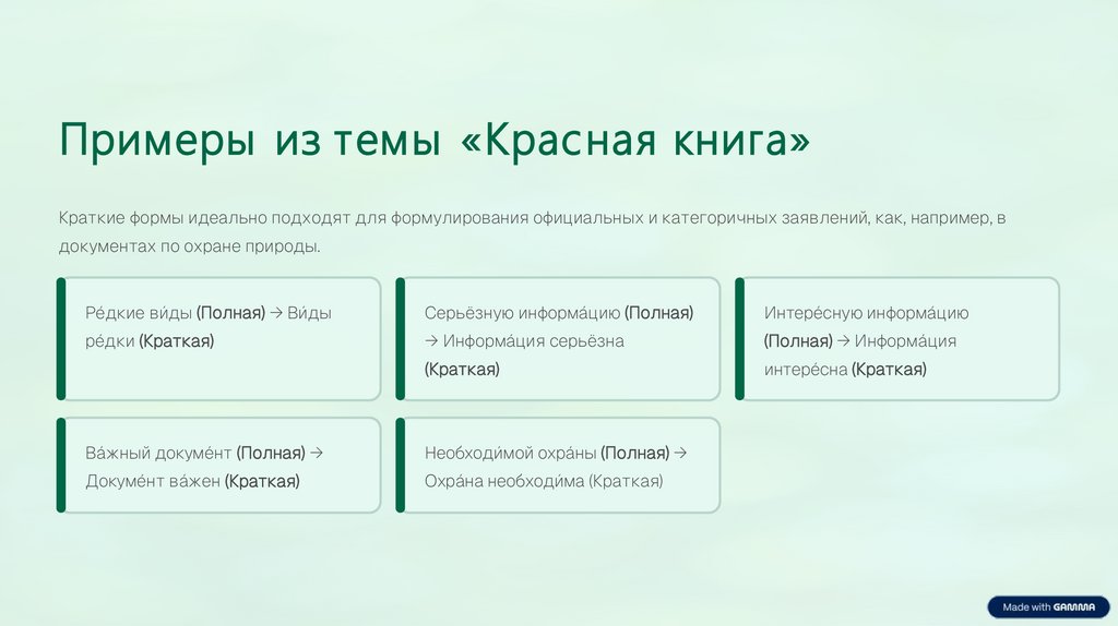 Примеры из темы «Красная книга»Краткие формы идеально подходят для формулирования официальных и категоричных заявлений, как, например, в