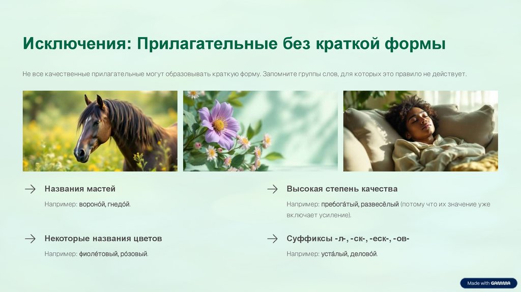 Исключения: Прилагательные без краткой формыНе все качественные прилагательные могут образовывать краткую форму. Запомните группы слов, для которых это правило не действует.
