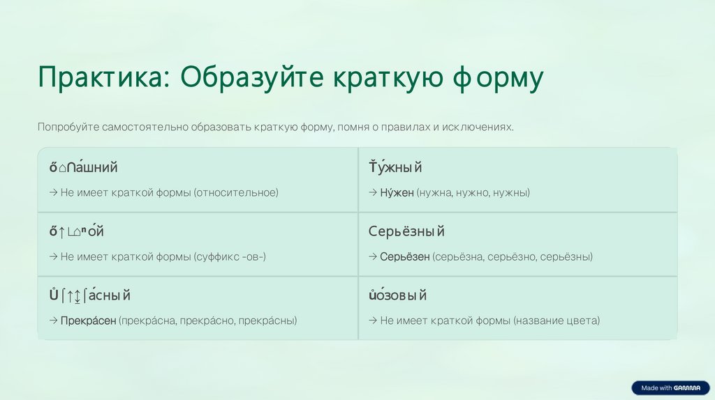 Практика: Образуйте краткую ф ормуПопробуйте самостоятельно образовать краткую форму, помня о правилах и исключениях.