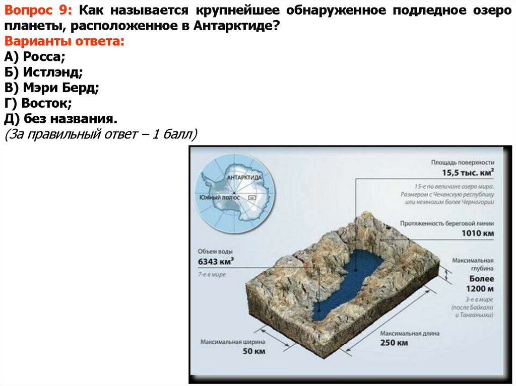 Вопрос 9: Как называется крупнейшее обнаруженное подледное озеропланеты, расположенное в Антарктиде?