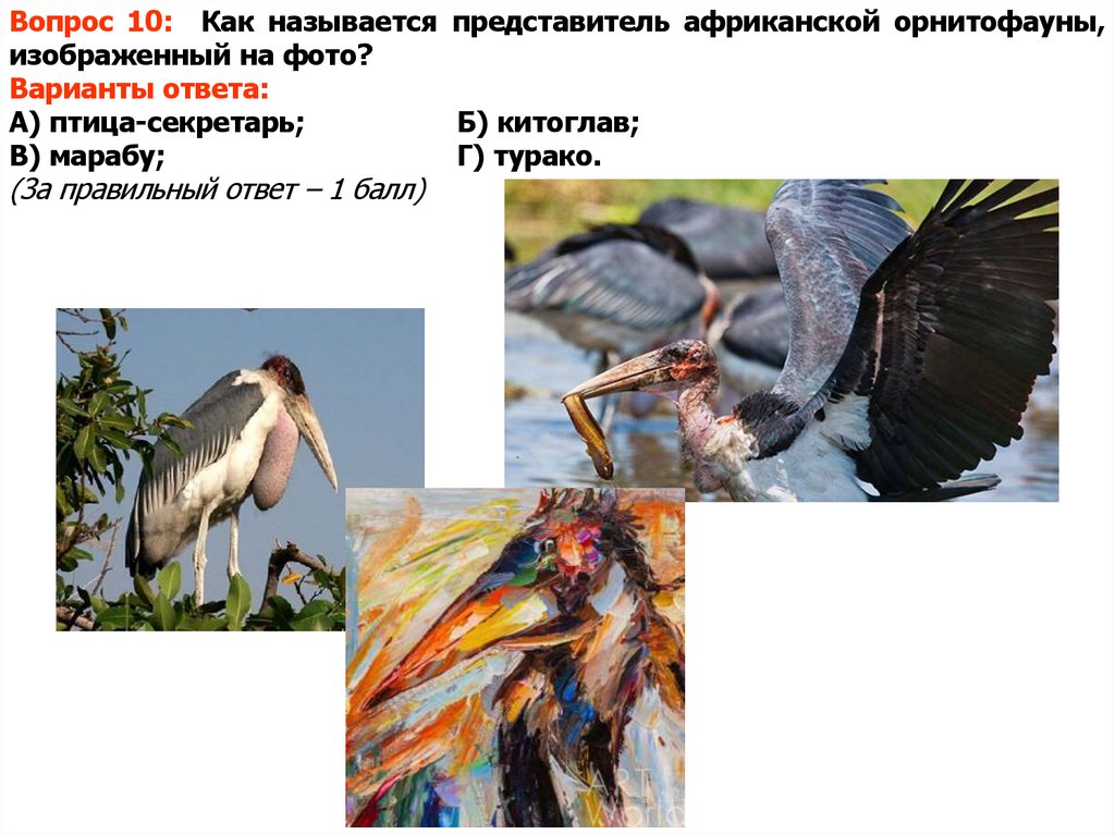 Вопрос 10: Как называется представитель африканской орнитофауны,изображенный на фото?