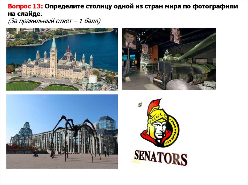 Вопрос 13: Определите столицу одной из стран мира по фотографиямна слайде.