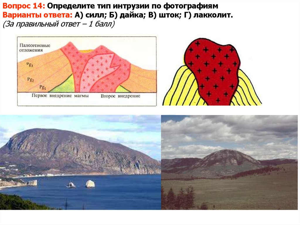Вопрос 14: Определите тип интрузии по фотографиямВарианты ответа: А) силл; Б) дайка; В) шток; Г) лакколит.