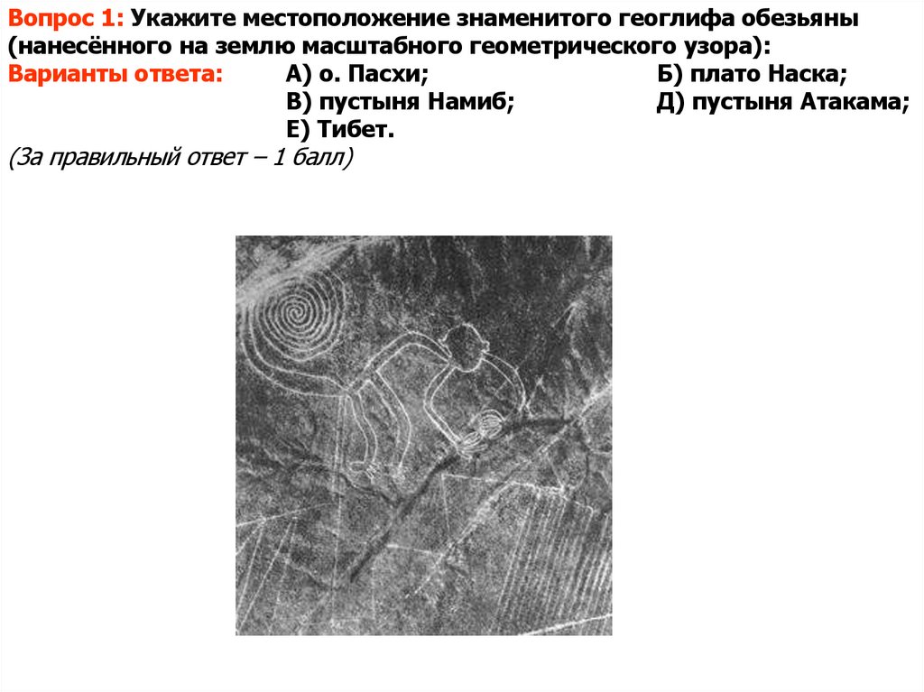 Вопрос 1: Укажите местоположение знаменитого геоглифа обезьяны(нанесённого на землю масштабного геометрического узора):