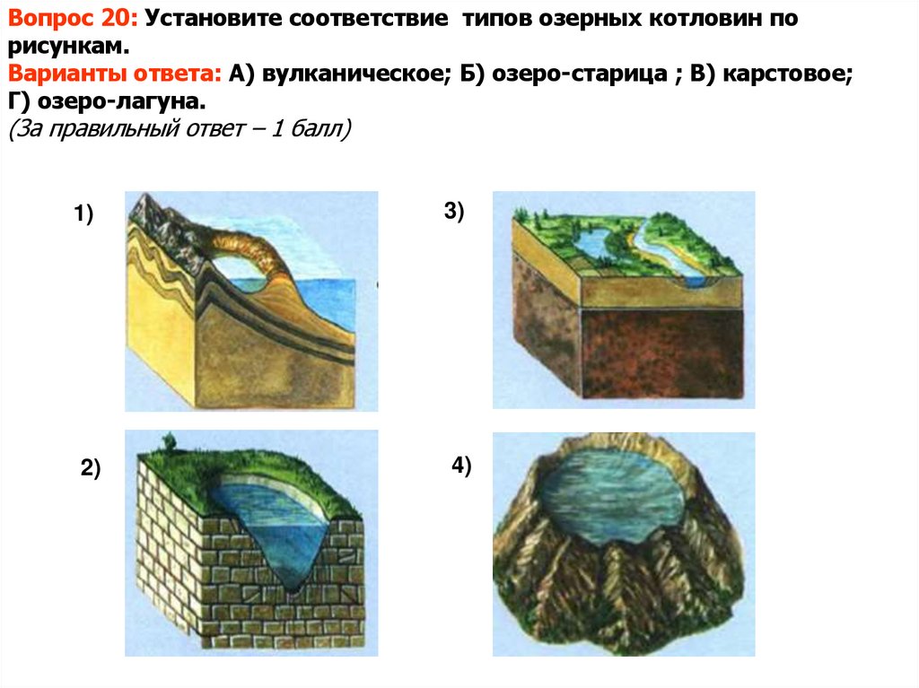 Вопрос 20: Установите соответствие типов озерных котловин порисункам.