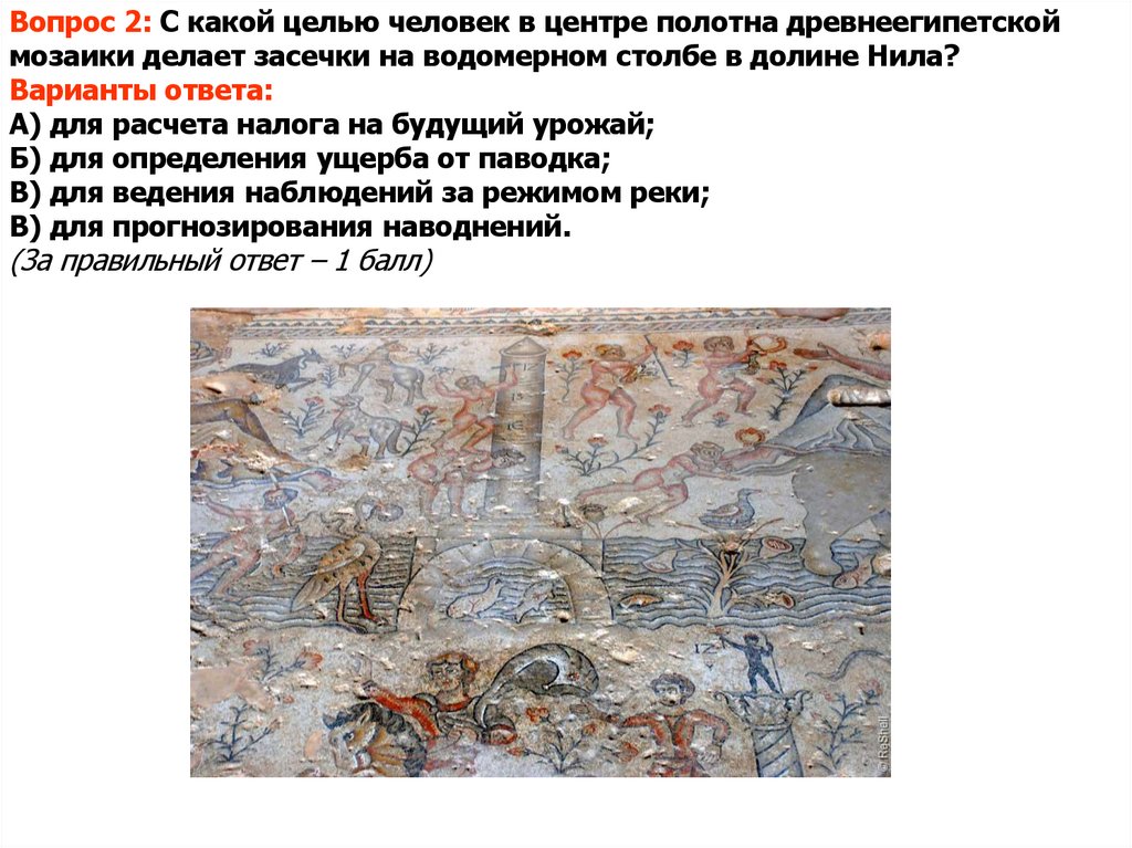 Вопрос 2: С какой целью человек в центре полотна древнеегипетскоймозаики делает засечки на водомерном столбе в долине Нила?