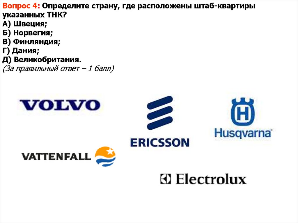 Вопрос 4: Определите страну, где расположены штаб-квартирыуказанных ТНК?