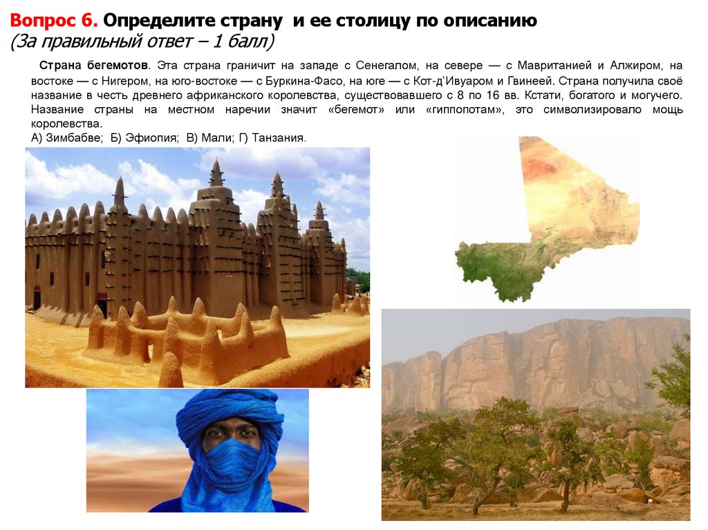 Вопрос 6. Определите страну и ее столицу по описанию(За правильный ответ – 1 балл)