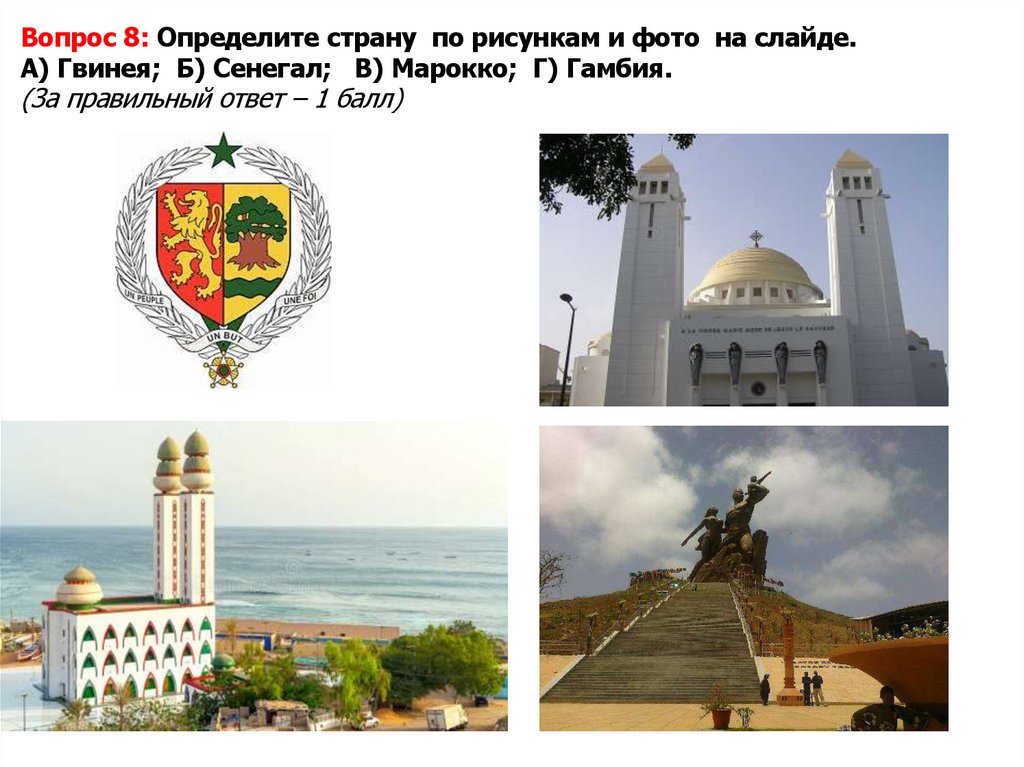 Вопрос 8: Определите страну по рисункам и фото на слайде.А) Гвинея; Б) Сенегал; В) Марокко; Г) Гамбия.