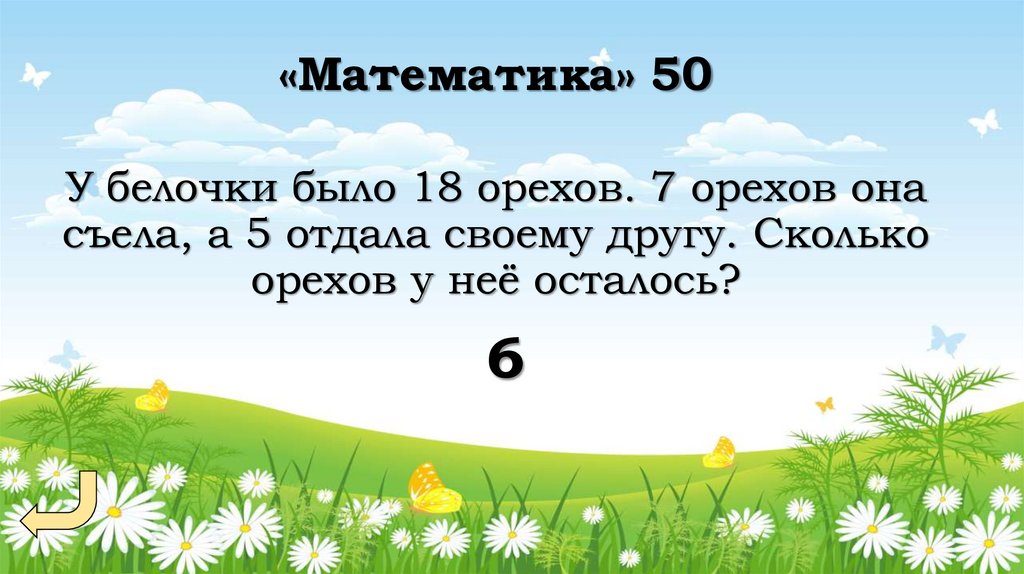 «Математика» 50У белочки было 18 орехов. 7 орехов она