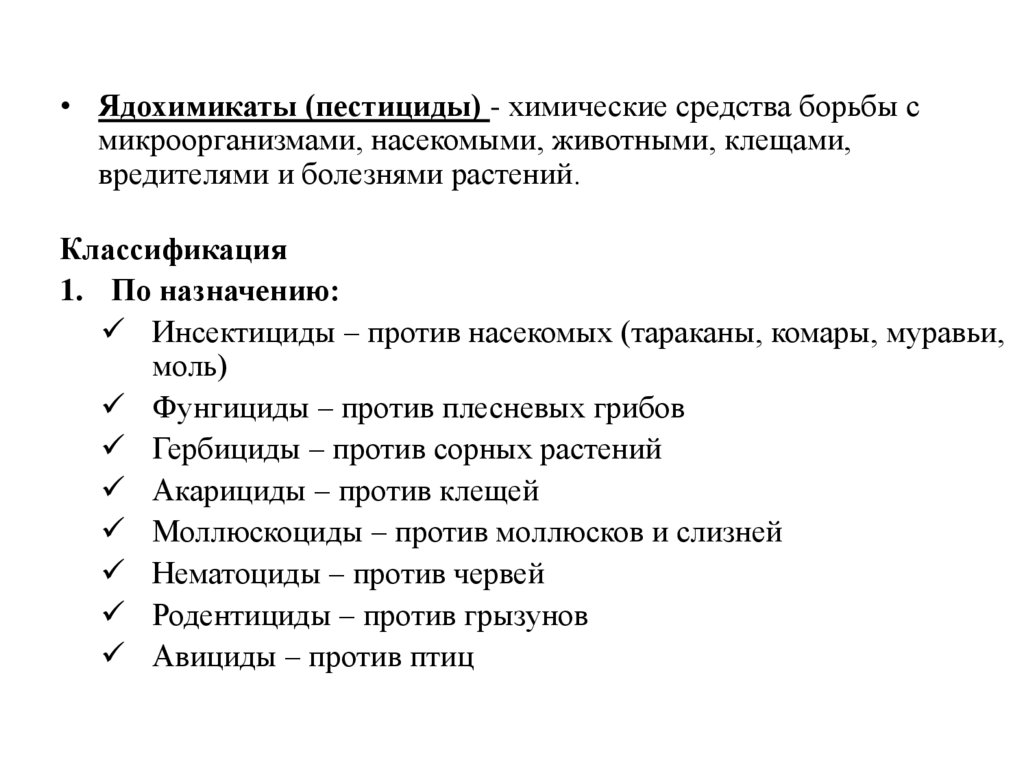 • Ядохимикаты (пестициды) - химические средства борьбы смикроорганизмами, насекомыми, животными, клещами,