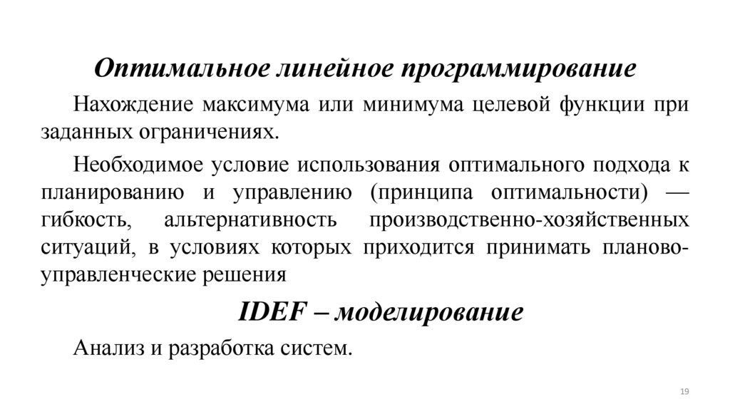 • модели линейного программирования;• оптимальные экономико-математические модели (имитационные