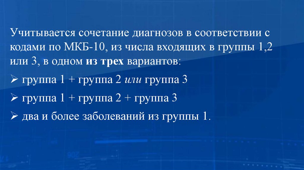 Учитывается сочетание диагнозов в соответствии скодами по МКБ-10, из числа входящих в группы 1,2