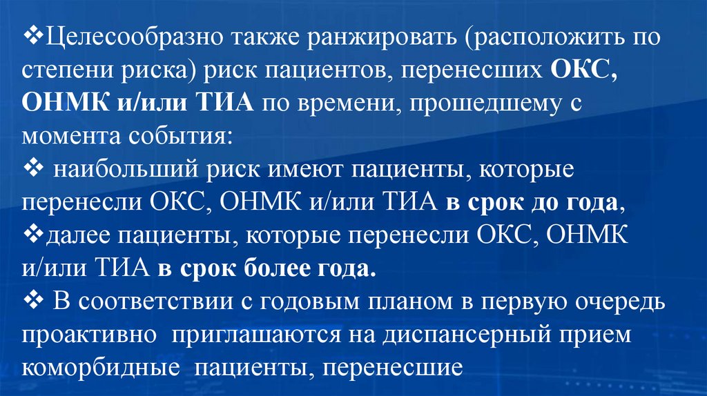 Целесообразно также ранжировать (расположить постепени риска) риск пациентов, перенесших ОКС,