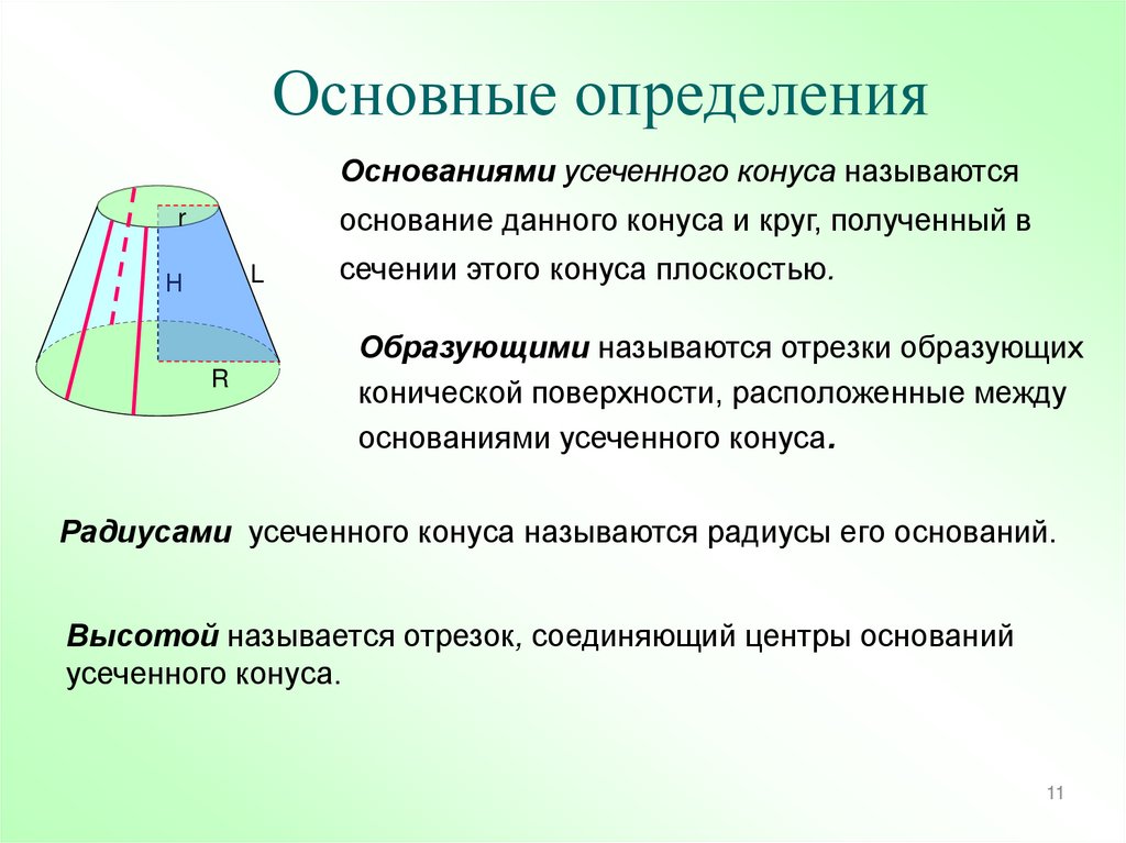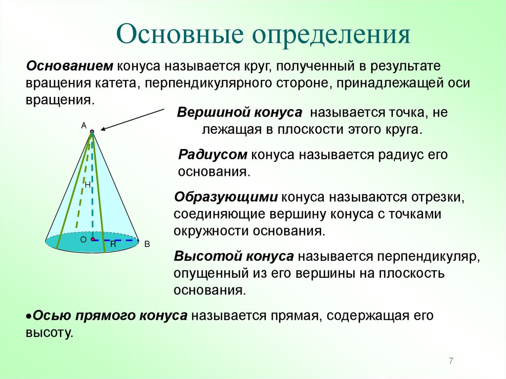 Основные определенияОснованием конуса называется круг, полученный в результате