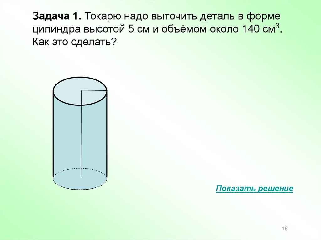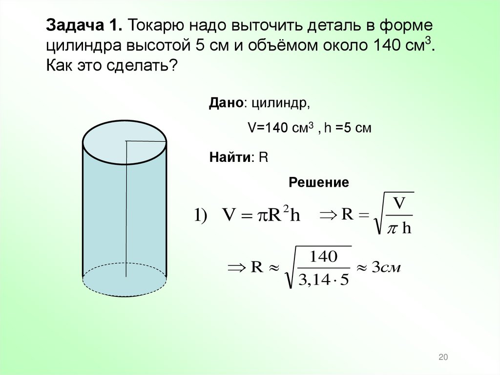Задача 1. Токарю надо выточить деталь в формецилиндра высотой 5 см и объёмом около 140 см3.