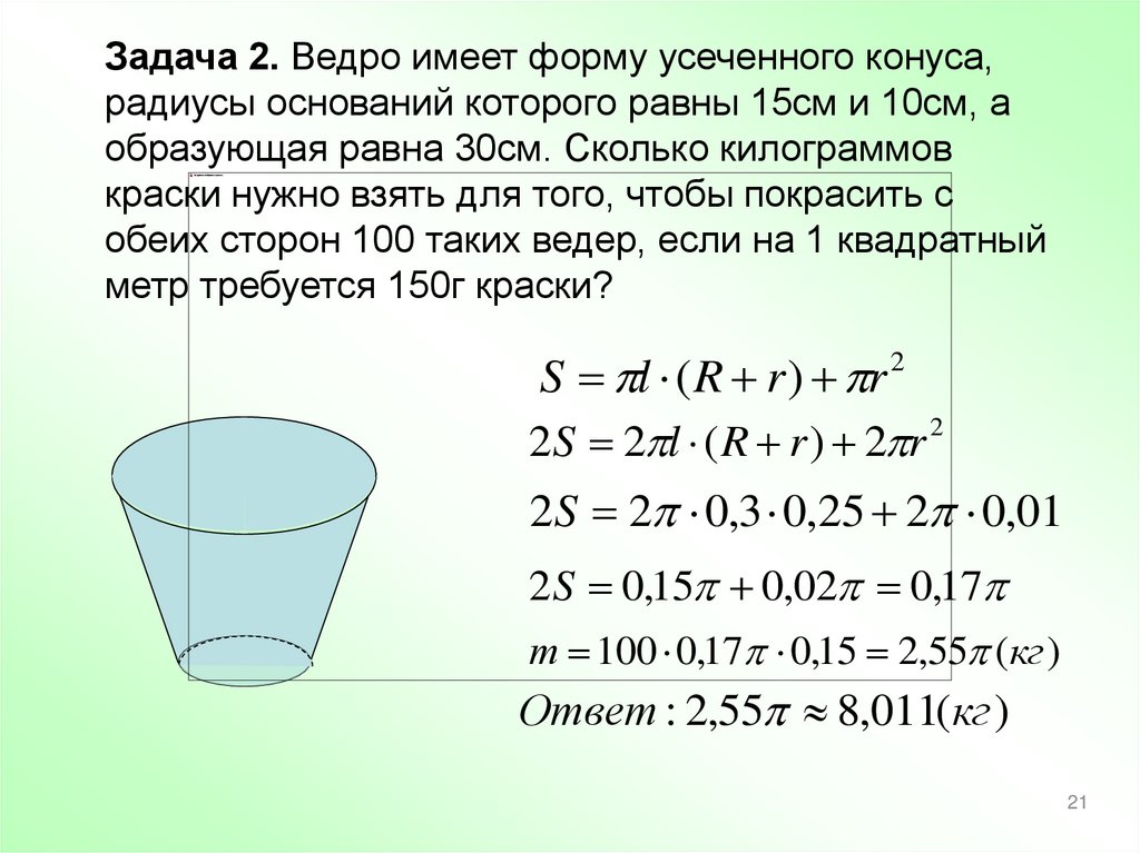Задача 2. Ведро имеет форму усеченного конуса,радиусы оснований которого равны 15см и 10см, а