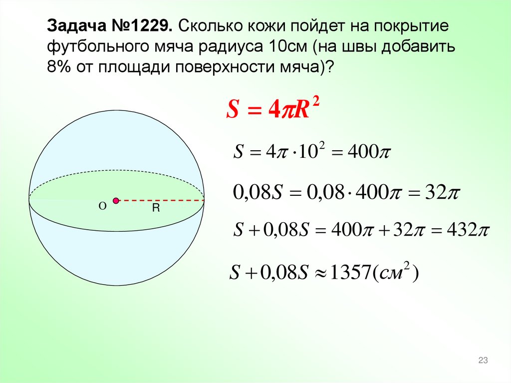 Задача №1229. Сколько кожи пойдет на покрытиефутбольного мяча радиуса 10см (на швы добавить