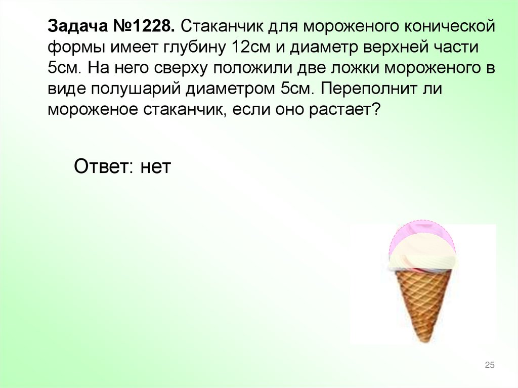 Задача №1228. Стаканчик для мороженого коническойформы имеет глубину 12см и диаметр верхней части