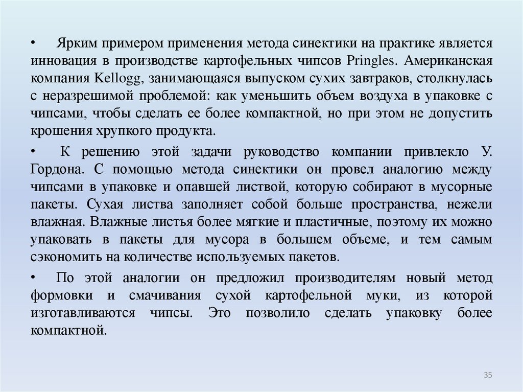 • Ярким примером применения метода синектики на практике являетсяинновация в производстве картофельных чипсов Pringles. Американская