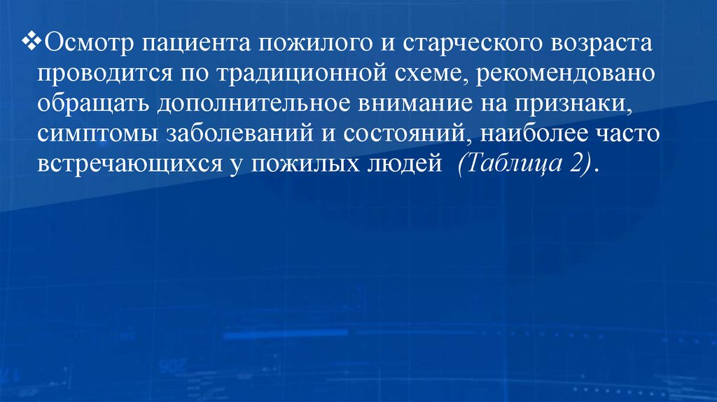 Осмотр пациента пожилого и старческого возрастапроводится по традиционной схеме, рекомендовано