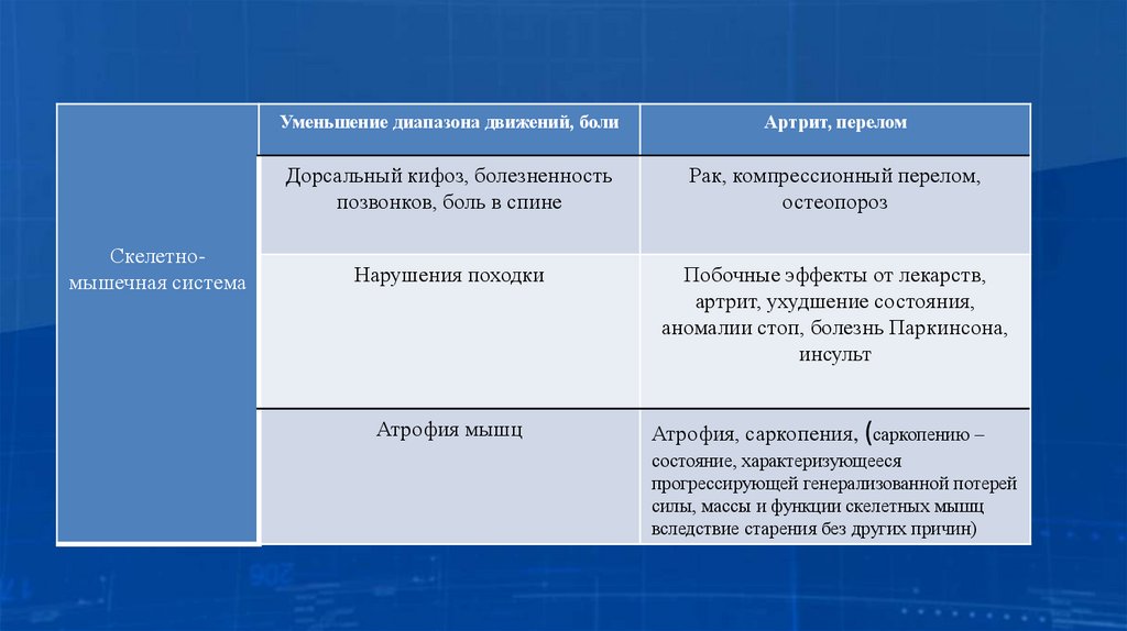 Скелетномышечная системаУменьшение диапазона движений, боли