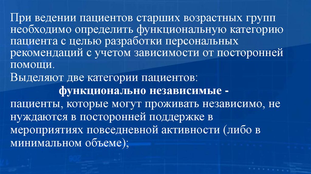 При ведении пациентов старших возрастных группнеобходимо определить функциональную категорию