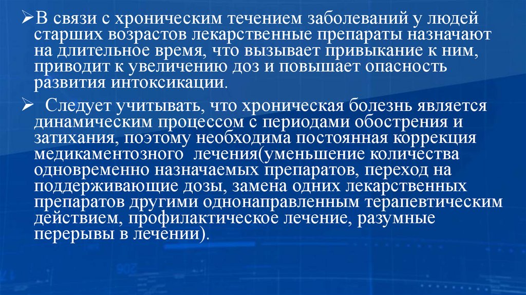 В связи с хроническим течением заболеваний у людейстарших возрастов лекарственные препараты назначают