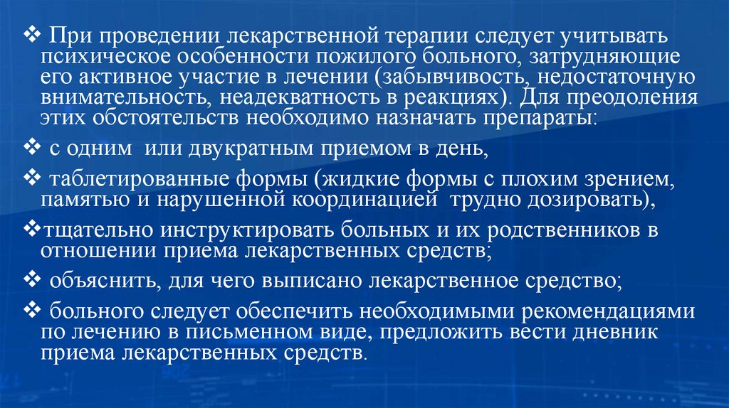 При проведении лекарственной терапии следует учитыватьпсихическое особенности пожилого больного, затрудняющие