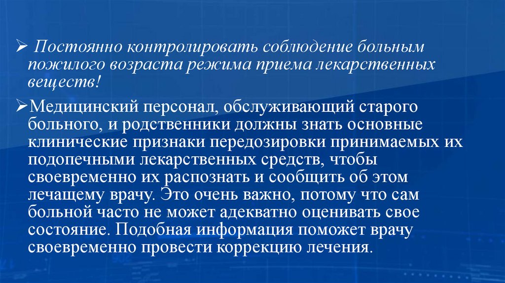 Постоянно контролировать соблюдение больнымпожилого возраста режима приема лекарственных