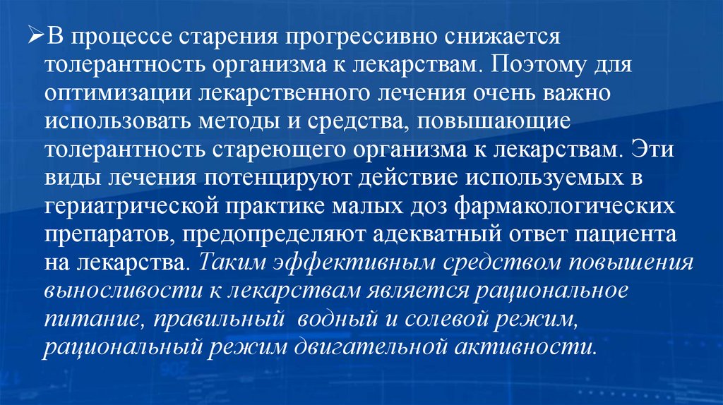 В процессе старения прогрессивно снижаетсятолерантность организма к лекарствам. Поэтому для