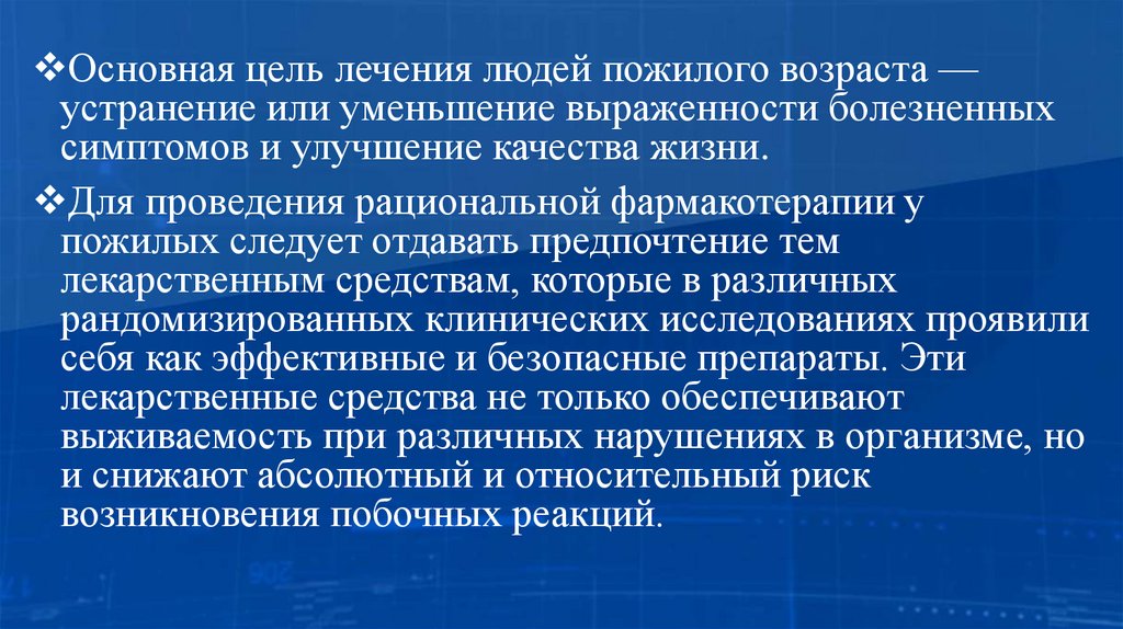Основная цель лечения людей пожилого возраста —устранение или уменьшение выраженности болезненных