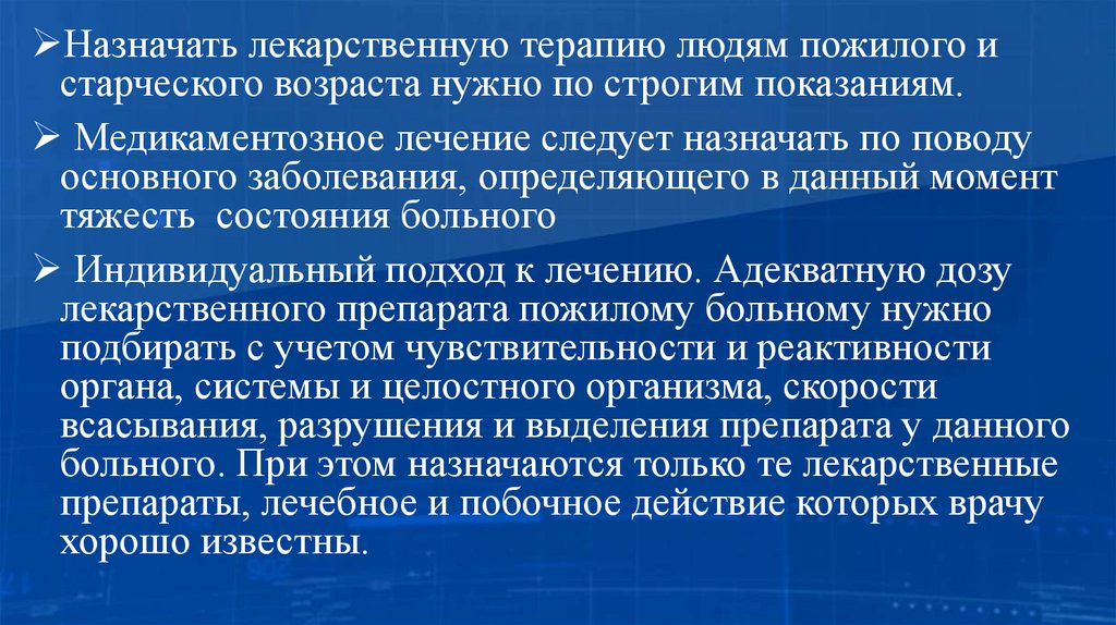 Назначать лекарственную терапию людям пожилого истарческого возраста нужно по строгим показаниям.