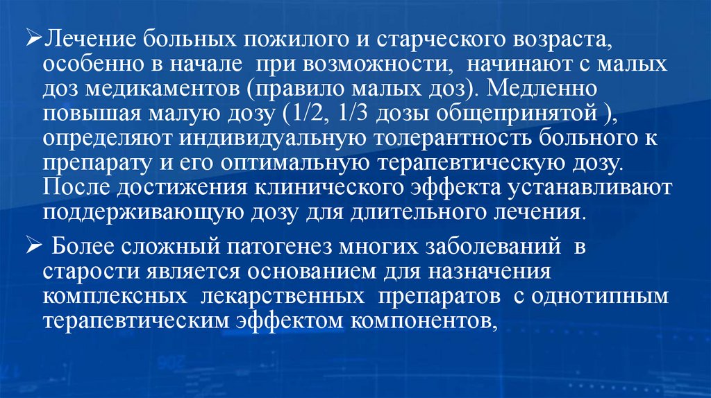 Лечение больных пожилого и старческого возраста,особенно в начале при возможности, начинают с малых