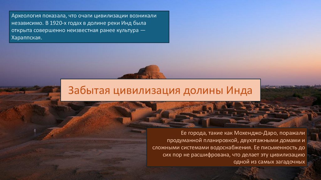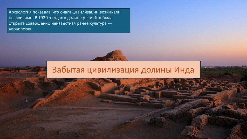 Археология показала, что очаги цивилизации возникалинезависимо. В 1920-х годах в долине реки Инд была