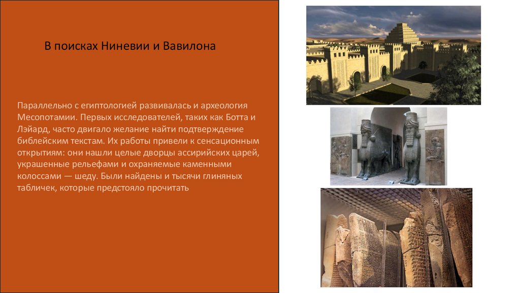 В поисках Ниневии и ВавилонаПараллельно с египтологией развивалась и археология