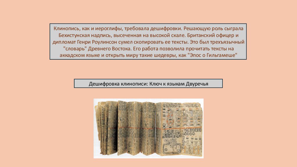 Клинопись, как и иероглифы, требовала дешифровки. Решающую роль сыгралаБехистунская надпись, высеченная на высокой скале. Британский офицер и