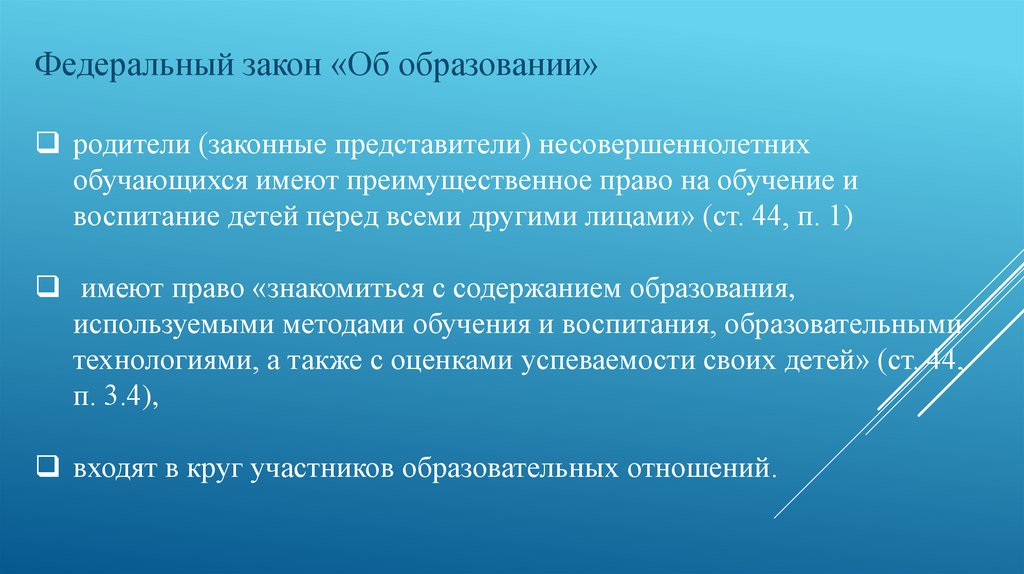 Федеральный закон «Об образовании»родители (законные представители) несовершеннолетних