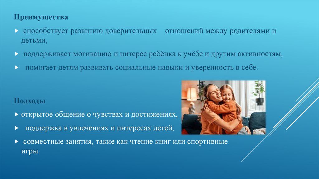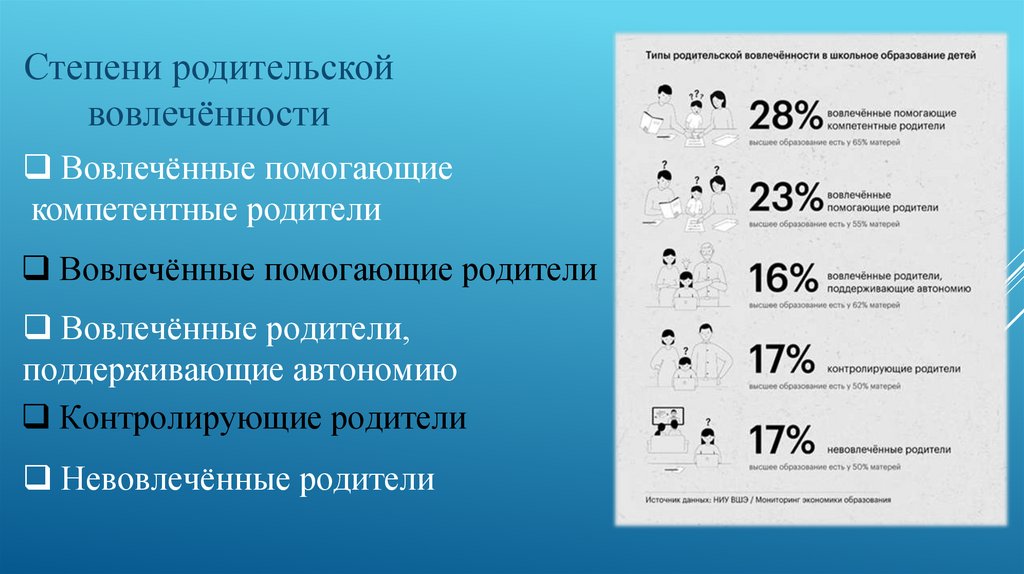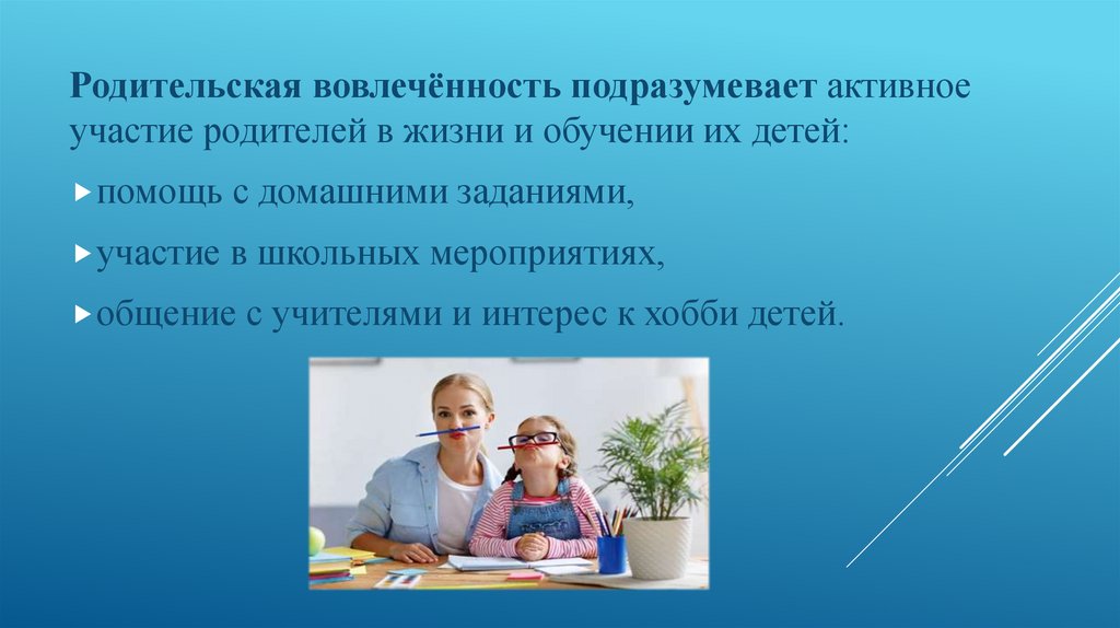 Родительская вовлечённость подразумевает активноеучастие родителей в жизни и обучении их детей: