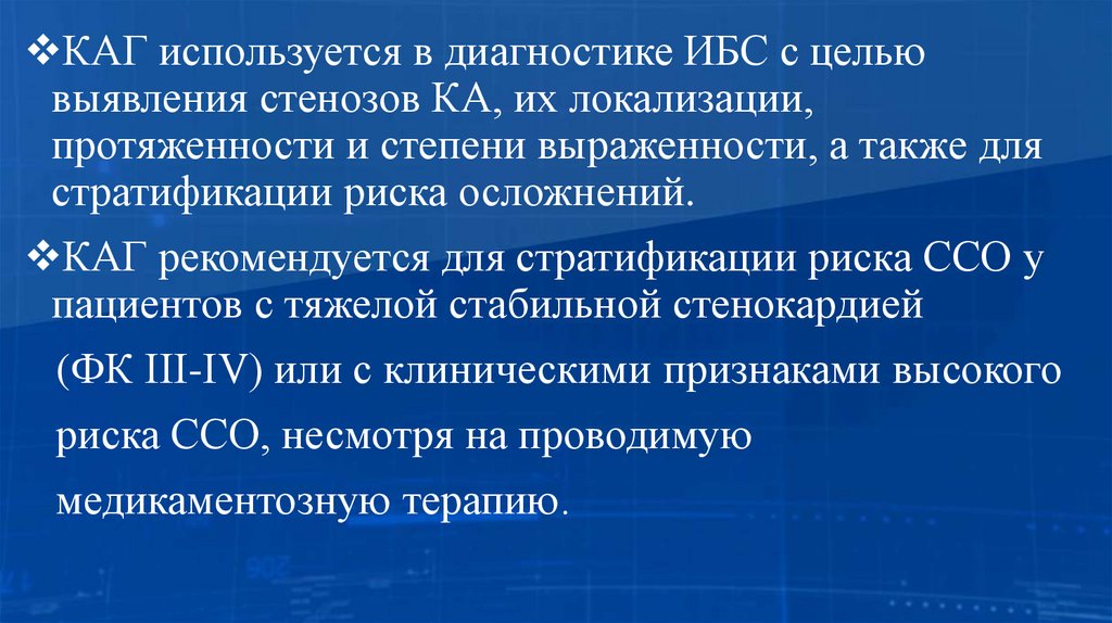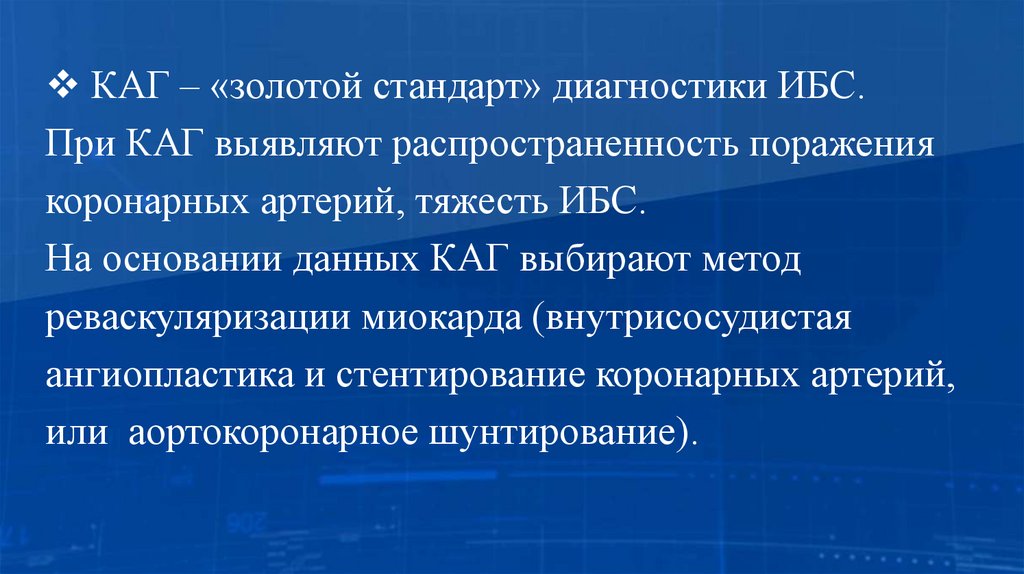 КАГ – «золотой стандарт» диагностики ИБС.При КАГ выявляют распространенность поражения