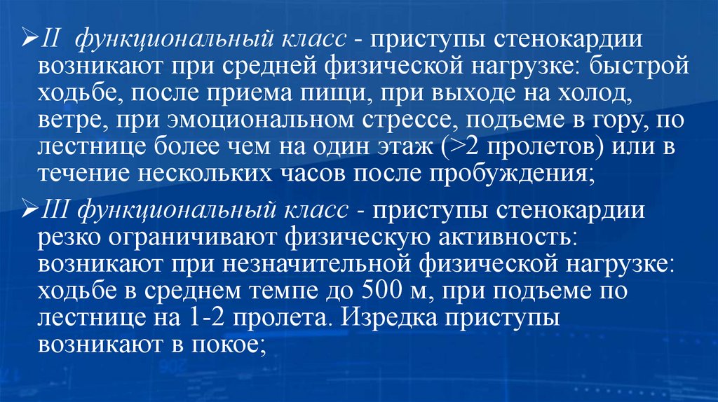 II функциональный класс - приступы стенокардиивозникают при средней физической нагрузке: быстрой