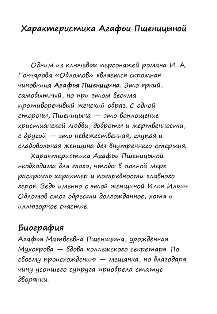 Характеристика Агафьи ПшеницынойОдним из ключевых персонажей романа И. А.