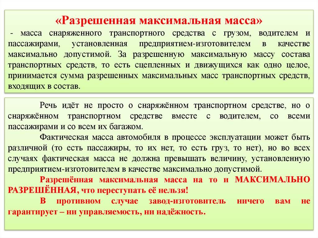 «Разрешенная максимальная масса»- масса снаряженного транспортного средства с грузом, водителем и