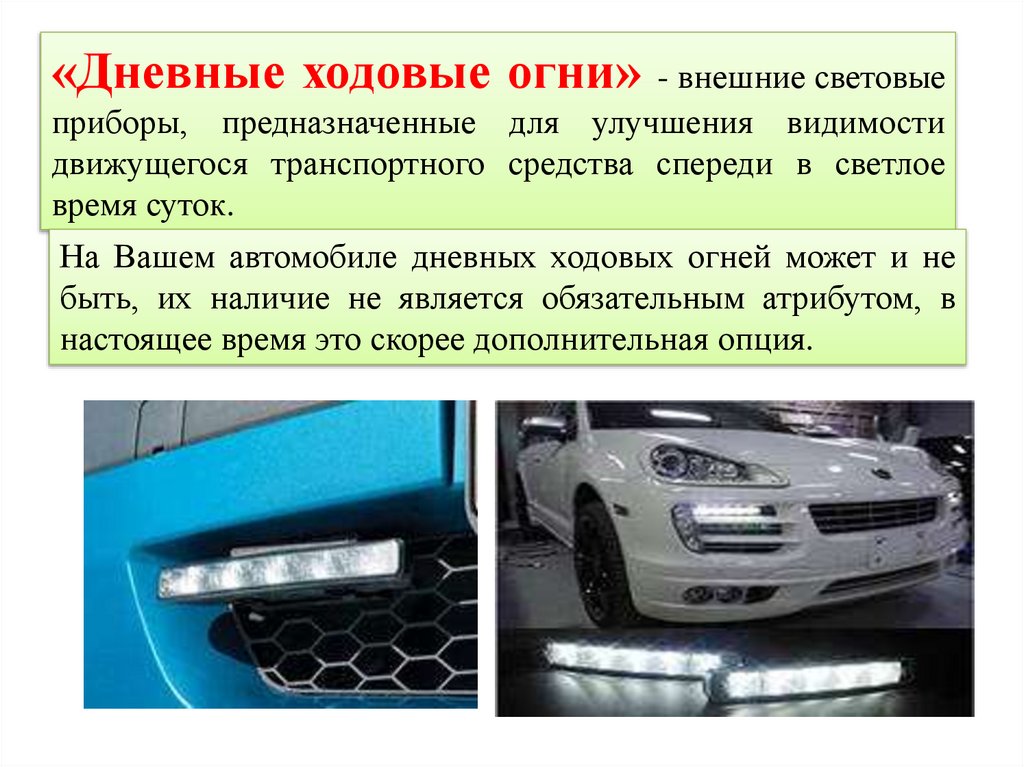 «Дневные ходовые огни» - внешние световыеприборы, предназначенные для улучшения видимости